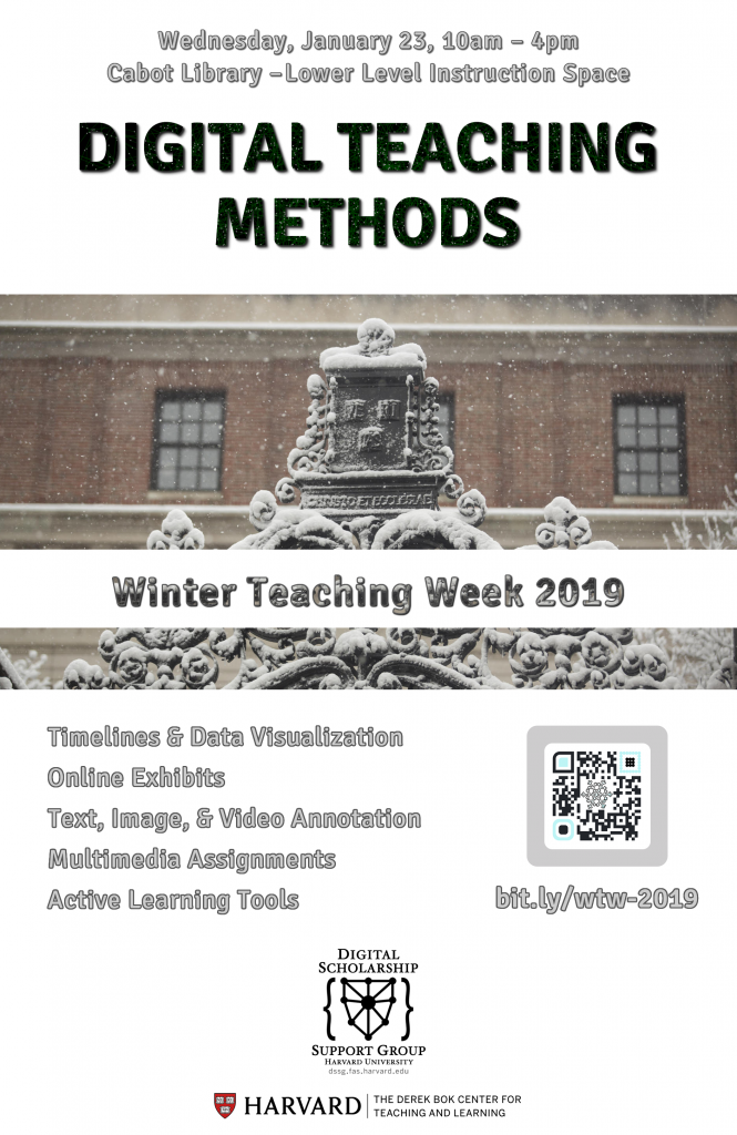 Join the Digital Scholarship Support Group for the Digital Teaching Methods workshop, a one–day seminar in the DSSG's Foundations Series that focuses on the thoughtful integration of digital tools and methods in teaching and learning. This iteration of the event is part of the Bok Center's Winter Teaching Week.