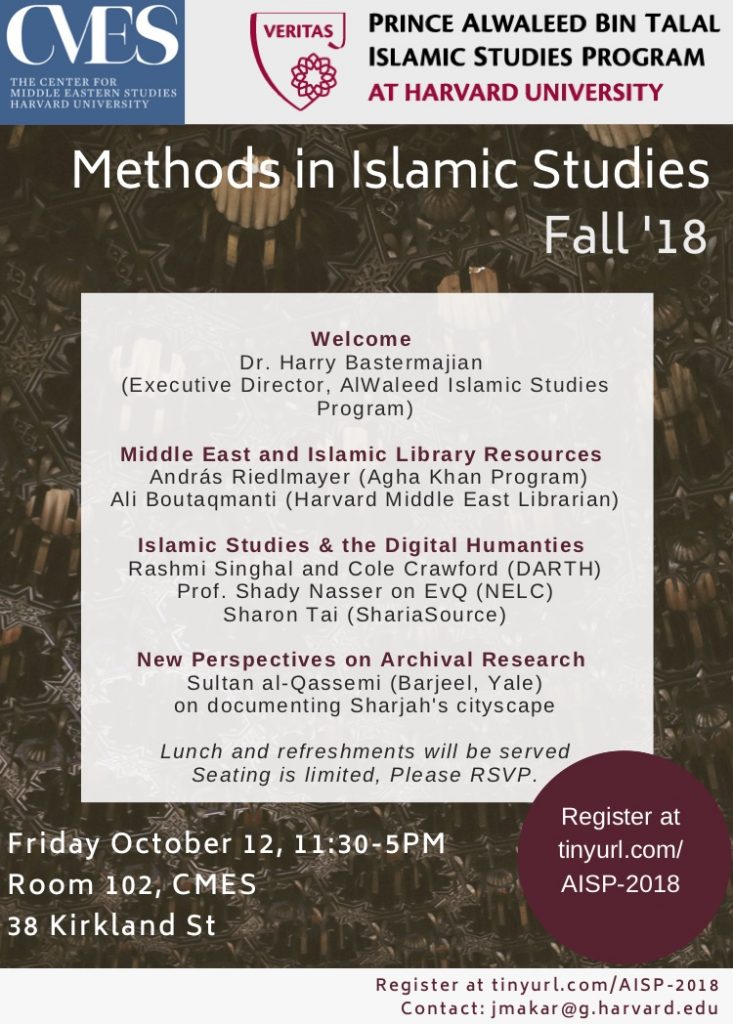 The Prince AlWaleed Bin Talal Islamic Studies Program is pleased to invite you to its Methods in Islamic Studies Workshop, which will be held on October 12 from 11:30AM to 5PM at the Center for Middle East Studies, Room 102 (38 Kirkland St).